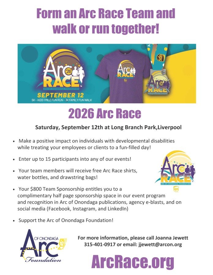Choose your event – the 5k, Kids 1 Mile Fun Run, or the 3k Family Fun Walk! Whether you run or walk, you will be supporting the Arc of Onondaga Foundation in its efforts to raise important funds so individuals with developmental disabilities can lead purpose-driven, independent and inclusive lives in our community.