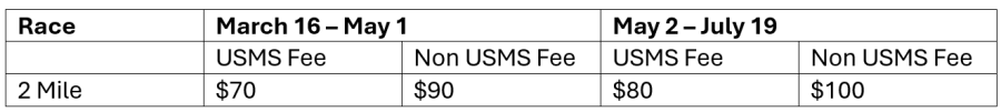 Early entry fee for the 1 mile is $90 ($20 discount for registered USMS members or $70) for entries received by 11:59 PM CT May 1, 2026. Regular entry fee for the 1 mile is $100 ($20 discount for registered USMS members or $80) for entries received by 11:59 CT July 19, 2026.