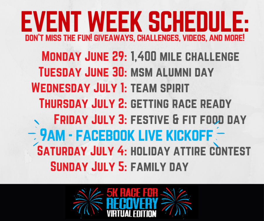 5K Race for Recovery 4th of July offers 5 events: 2 Mile Freedom Walk, 5K Race, VIP 5K Package, Virtual 5K, Kids Fun Run.