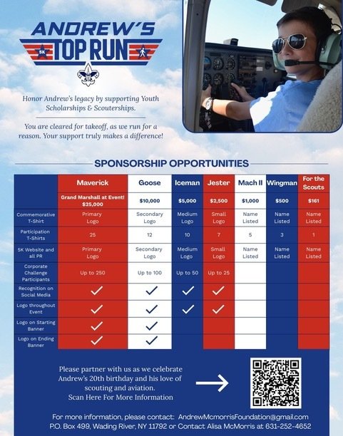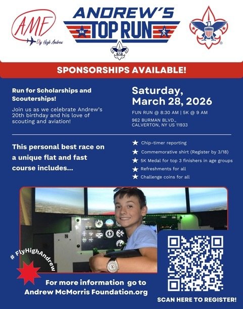 On Saturday, March 28th the Suffolk County Council of Boy Scouts of America and the Andrew McMorris Foundation will host the 5th Annual Andrew’s Top Gun Run to raise the funds for Scholarships and Scouterships.