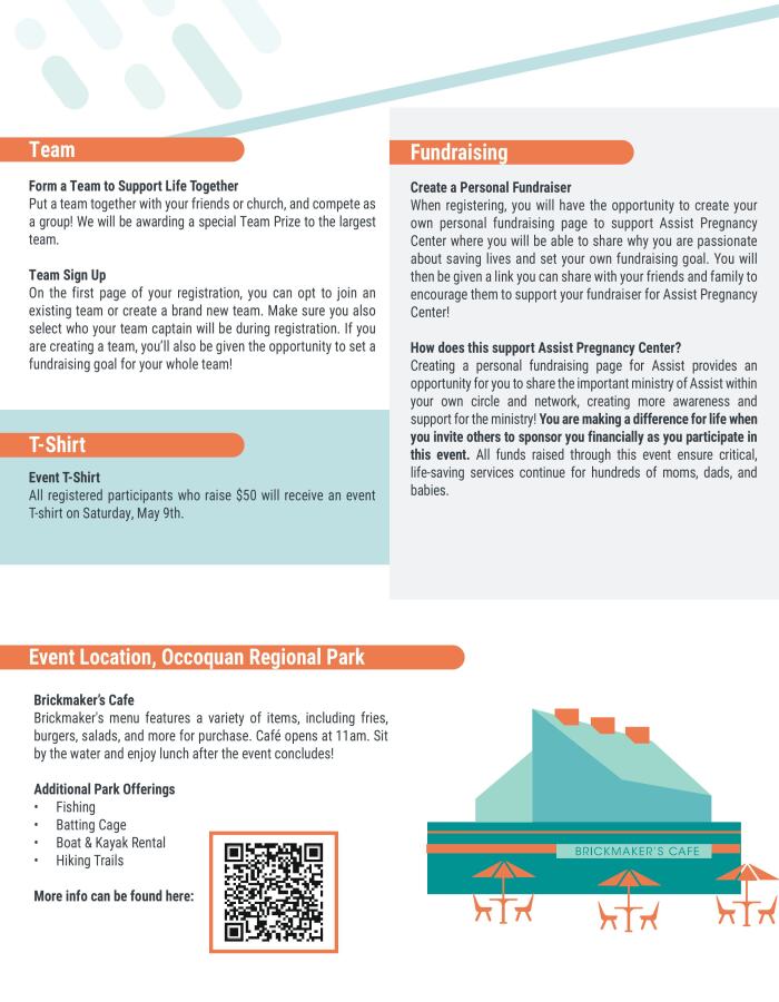 Details: IN-Person Walk Run Ride for Life Event! The event will take place on Saturday, May 9th at 10:00 am at Occoquan Regional Park. Sign up to participate as a walker, runner, or bike rider—and then invite others to sponsor you! Following event completion, stay for food, fun activities, prizes, and ministry stories as we celebrate LIFE together.