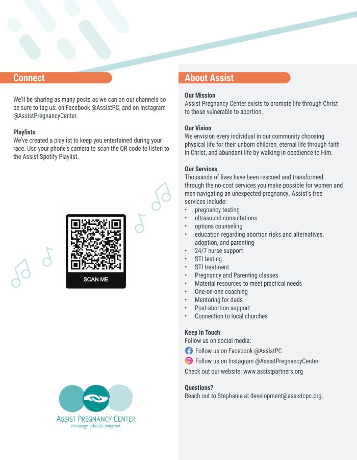 Assist Pregnancy Center is a local clinic that helps women and men experiencing an unplanned pregnancy with practical medical care, counseling, and relational support. Because of Assist, families are empowered to choose life for themselves and their unborn children. All of their services are provided at no cost and benefit our community. (Learn more about Assist at www.assistpartners.org).
