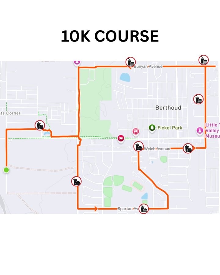 The start/finish is a Grace Place and crosses Mountain Avenue then down Mountain Avenue then back across Mountain Ave and down Berthoud parkway and left on Spartan avenue and left up through 8th street to Welsch. Welsch to 2nd street and up to Bunyan street. Bunyan street to Berthoud Parkway and back to Grace Place.