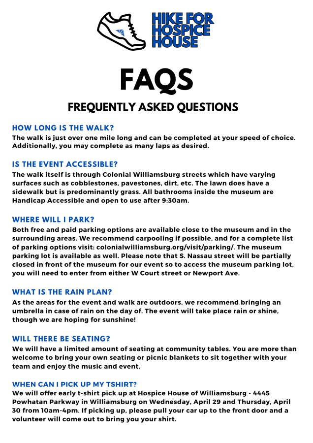 At this year's Hike for Hospice House, presented by Toano Contractors, Inc., we celebrate life by walking one mile through Colonial Williamsburg followed by a memorial program, activities for the whole family, and special ways to remember the lives of our loved ones, all raising funds in support of this important community resource. We hope you'll join us as we join together as a community to remember the lives that touched ours.
