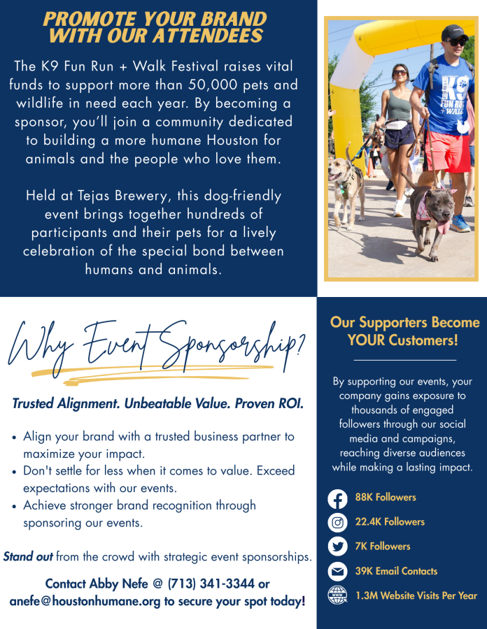 Please review our 2026 K9 Fun Run + Walk Sponsorship Packet for more information. Fill out the form and email to anefe@houstonhumane.org. Contact Abby Nefe for more information at anefe@houstonhumane.org or call (713) 341-3344..
