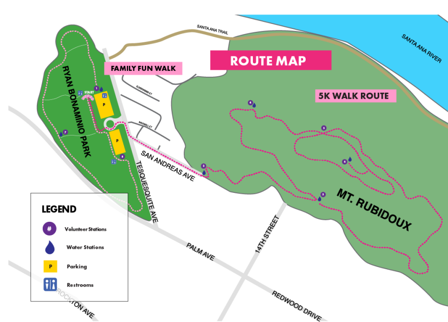 We have TWO routes for ONE cause, a beginner 1.8K Family Fun route which goes around the park and, for the more ambitious, an intermediate 5K Mt. Rubidoux route which goes up the mountain.