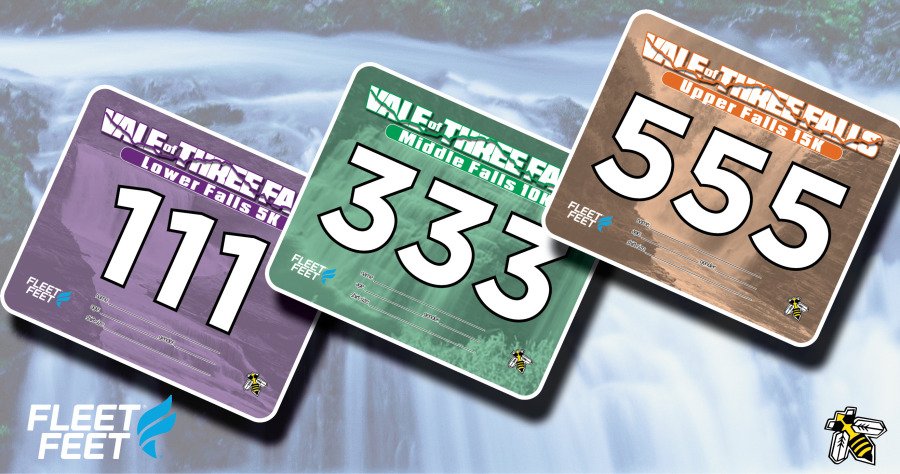 Back again are Finisher Medals for each Vale of Three Falls race. Depicted are the bibs and the tee colors for each race.