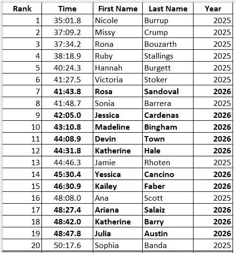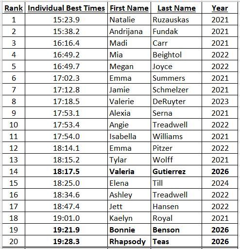2.5-Mile: Women's Top 20 Best PR Times: