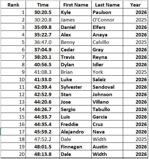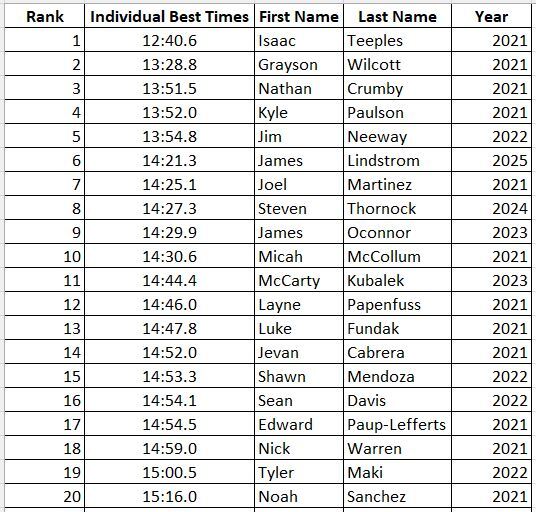 2.5-Mile: Men's Top 20 Best PR Times:
