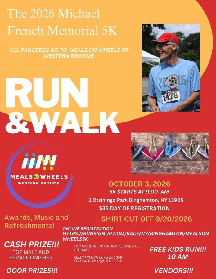 The Michael French Memorial Meals on Wheels of Western Broome 5K Run/Walk takes place on Saturday, October 3, 2026 in Binghamton, NY.