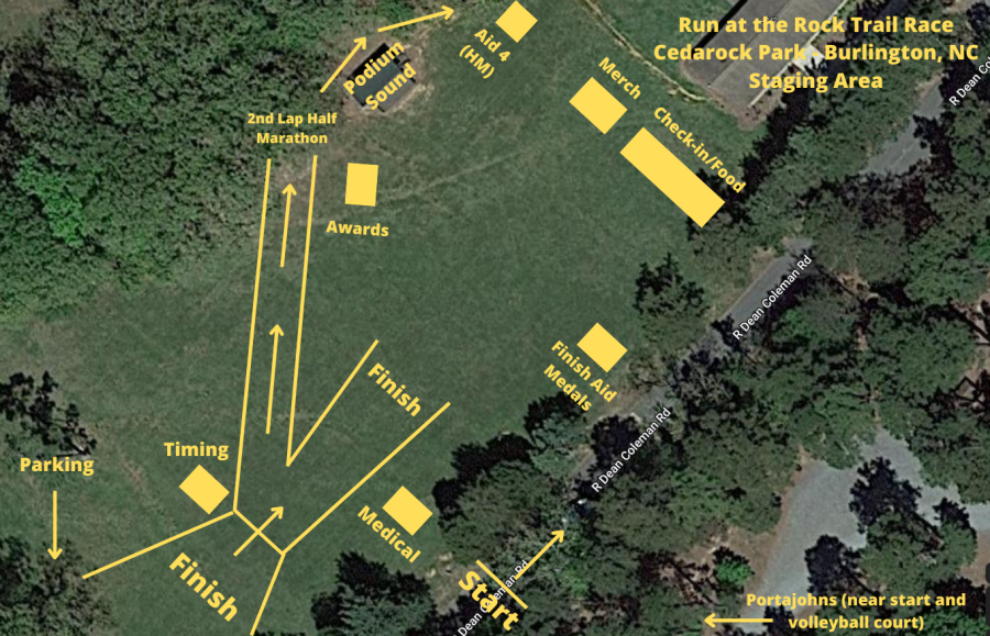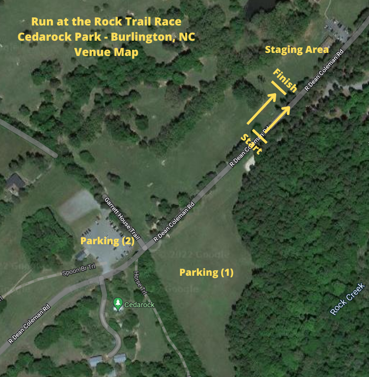 Cedarock Park: 4242 R. Dean Coleman Road, Burlington, NC 27215 (enter park and follow signs to race parking)