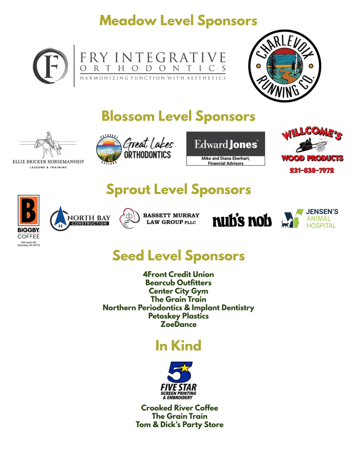 Check-in: You must check in prior to the event. Packet pickup is Friday, May 15 from 3:30-5:30pm at Petoskey Children's Nature Preschool (1804 E Mitchell, Petoskey, MI 49770), or at the event from 8:00-10:00am.