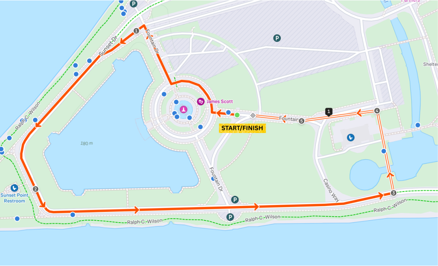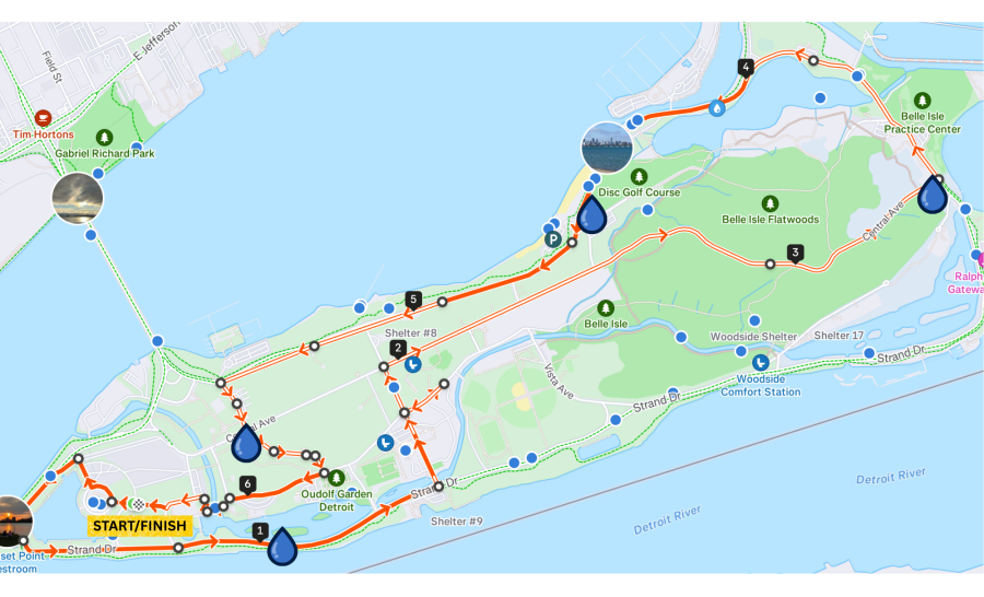 The start/finish line is at the Scott Memorial Fountain, Sunset Dr, Detroit, MI. Parking is conveniently located in a large lot beside the start/finish area.