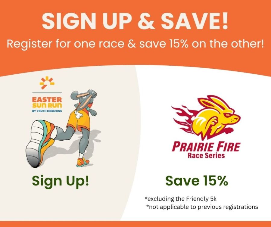 Sign up for the Easter Sun Run on Saturday, April 4 at Sedgwick County Park and get 15% off your Prairie Fire registration (see details below).