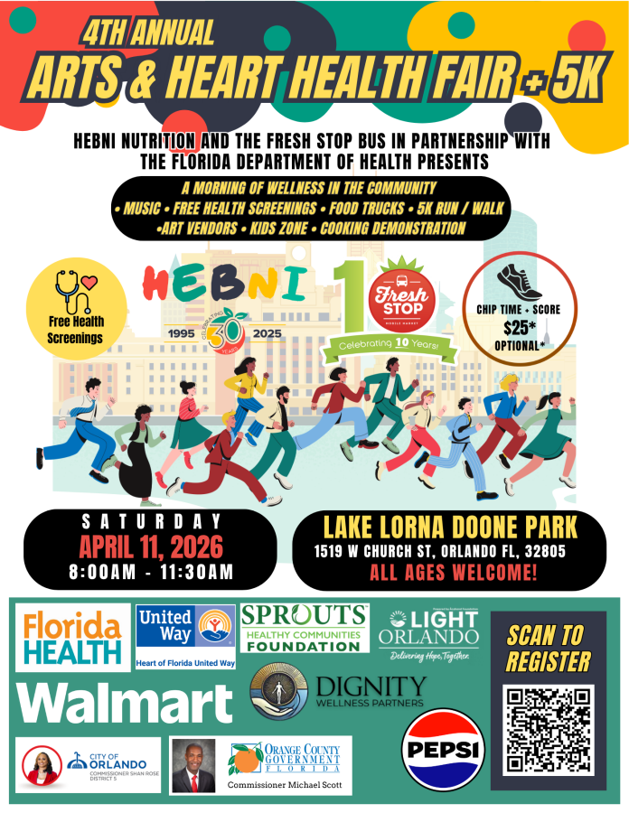 Hebni Nutrition Consultants, in partnership with the Florida Department of Health, presents the Arts and Hearts Health Fair & 5K: A Morning of Wellness in the Community. Hebni Nutrition Consultants, Inc. (Hebni) is a community-based, nonprofit 501(c)(3) organization founded in 1995 to educate high-risk, culturally diverse populations on nutrition strategies that prevent diet-related diseases. Hebni is known for developing culturally rooted programs such as the Soul Food Pyramid and Sisters: Take Charge of Your Health, which address populations disproportionately impacted by cardiovascular disease, cancer, diabetes, and obesity.