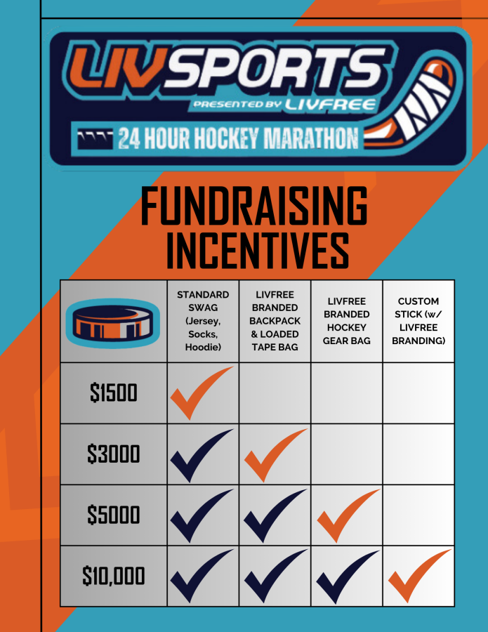 Here’s how it all works - the event is a continuous game with 60 to 90 skaters playing on two teams in 3 rotating groups based on ability with a running score from opening puck drop to the final horn. Each player raises $1500 dollars for the cause. LivFree is a pediatric cancer non-profit organization that provides children and their families with moments of joy to take a break from struggle and enjoy some family time together. Whether it's tickets to a game, a broadway show, a night out - LivFree is here to help the whole family.