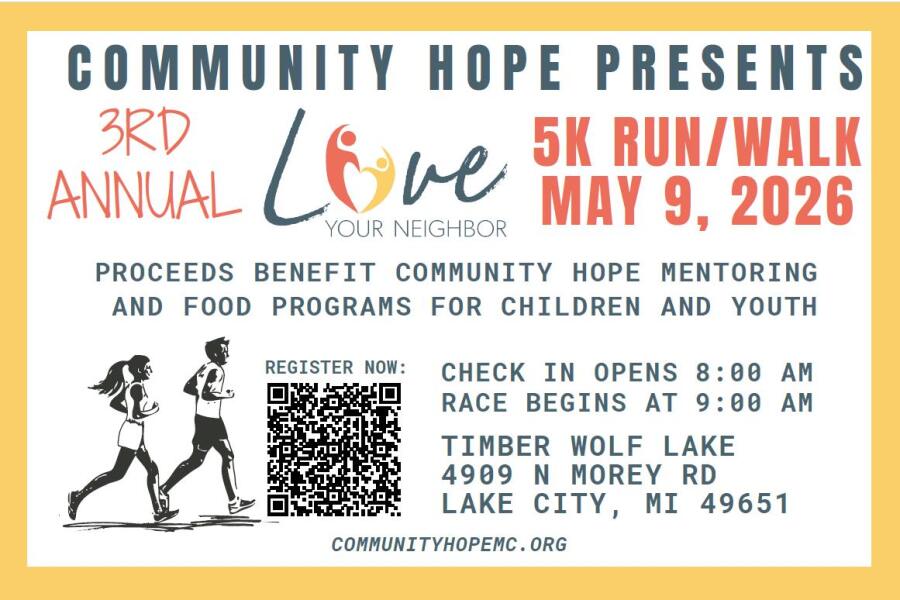 Support Missaukee County kids by participating in Community Hope's Love Your Neighbor 5K Run/Walk, Saturday, May 9, 2026 at 9 A.M.