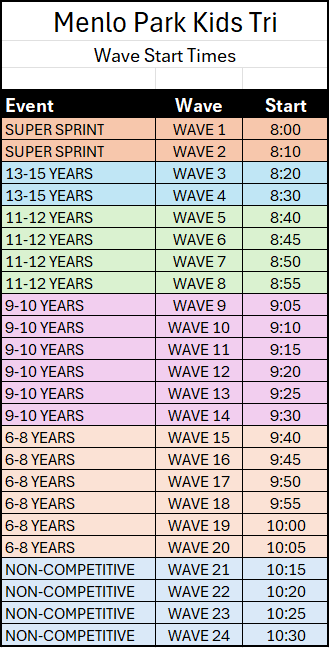 There will be many waves in each age group but your athlete must be at the event 60-90 minutes before their wavestart time to allow time to pick up thier packet, set up their transition area and be ready to start.