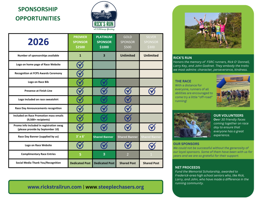 Without our generous sponsors, we would not be able to bring Rick's Run to life, while also raising significant funds for the Frederick Steeplechasers Memorial Scholarship.