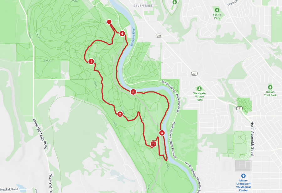 From West (Airway Heights/US 2): In Airway Heights, turn left (north) on Hayford Rd. At 1.8 miles, continue on W Trails Rd. After 1.5 miles, turn left (north) on Old Trails Rd. Go 5.3 miles, turn right (east) on Seven Mile Rd. After 1.4 miles, turn right (south) on Riverside immediately before crossing the bridge. Follow signage to race parking on your right.