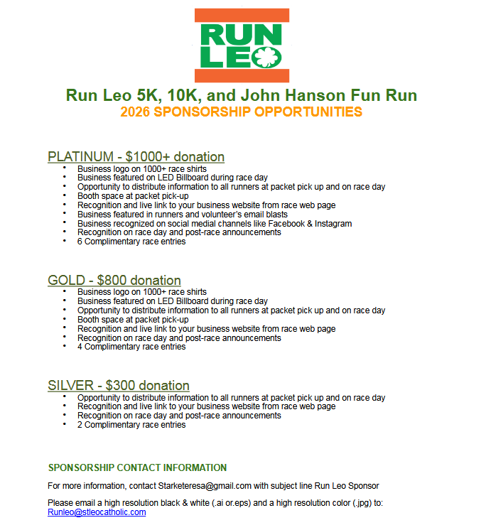 If you or your business are interested in being a sponsor for the 2026 Run Leo race, please email runleo@stleocatholic.com for more information.