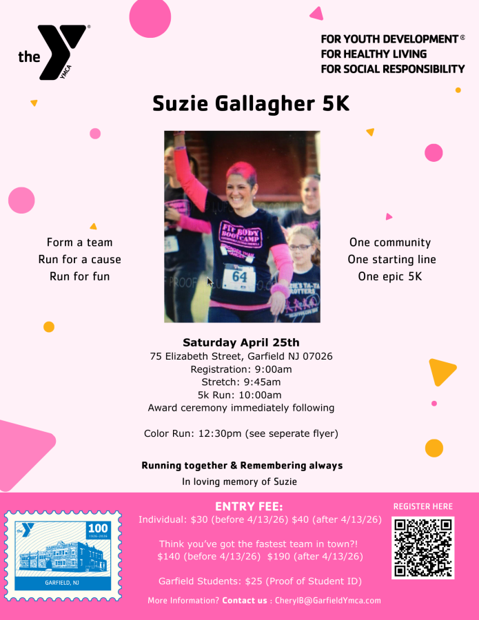 Suzie Gallagher 5K & Color Run takes place on Saturday, April 25, 2026 in Garfield, NJ.