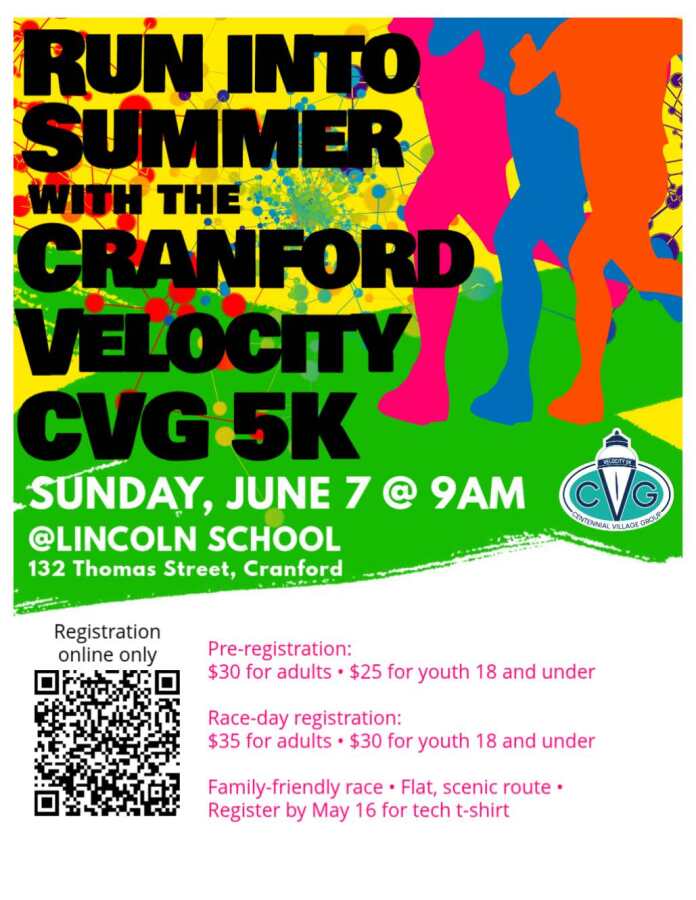 The CVG Velocity 5k takes place on Sunday, June 7, 2026 in Cranford, NJ.