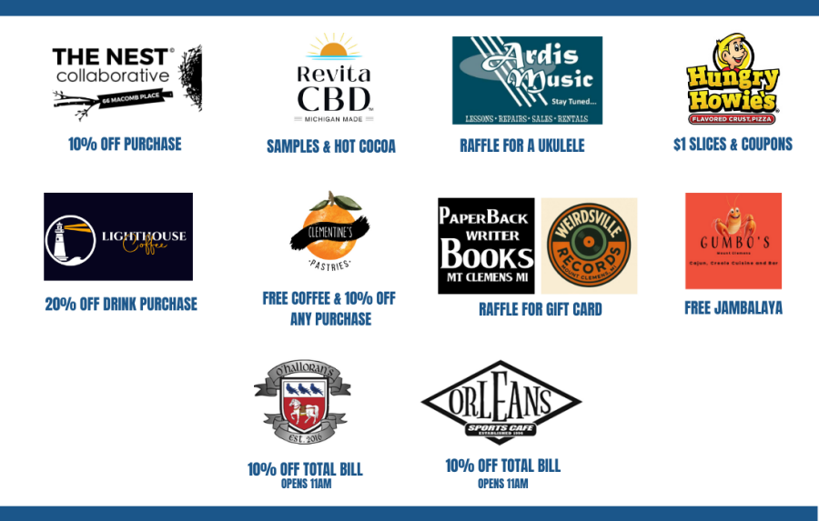 Giveaways, raffles & discounts at select Downtown Mt Clemens businesses along the route