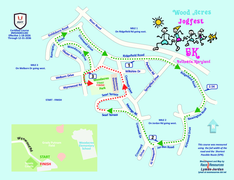 JogFest is a rain or shine event! Please come out to support Wood Acres Elementary with your friends and neighbors. Participants can choose the 5K Race, One Mile Race or 1/4 Mile Fun Run. Please check out the map for the official 5K course, which starts and finishes at the Wood Acres Local Park (5850 Wynnwood Road) and goes through the Wood Acres neighborhood of Bethesda, MD, through rolling hills on quiet neighborhood streets.